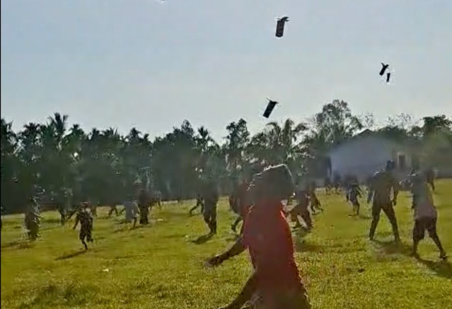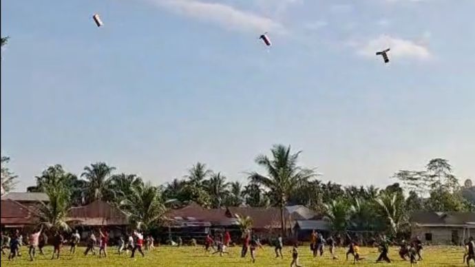 Masyarakat dari berbagai usia, mulai dari anak-anak, orang tua, hingga lansia, berteriak bahagia menyambut bantuan yang jatuh perlahan dari udara. Anak-anak berlarian dengan tawa lepas, mengikuti arah helibox yang mendarat satu per satu di lapangan. Begitu menyentuh tanah, warga segera mengerubungi kotak-kotak tersebut, merayakan kedatangan bantuan.
